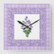 Un reloj de pared cuadrado de bonito con un motivo de violetas, una de las flores del Mes de Nacimiento de Febrero, de una pintura acuarela de Judy Adamson, bordeada por un patrón de violetas y el Check Gingham. Parte de la colección "Sweet Violets" de Posh & Painterly.