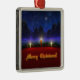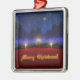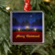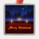 Escena de Navidades en 3D creada en Vue, con velas puestas en rojo frente de un guirnalda de pino acentuado con adornos rojos y dorados. En el fondo nevado hay abetos de color azul-verde frente a un cielo fractal agitado salpicado de estrellas. Una sola estrella brillante domina el cielo nocturno. Delante de las decoraciones navideñas hay un brillante saludo de oro Feliz Navidad.