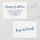 Mantén a tus amigos y familiares al día con tu nueva dirección usando estas sencillas y elegantes tarjetas de alojamiento. Las notas versátiles dicen "Cambio de dirección" en la parte delantera y "¡Manténgase en contacto!" en la parte posterior, utilizando un tipo de letra de escritura moderno, audaz y manuscrita. Utilice los campos de plantilla para agregar todos sus propios detalles al personalizar de este diseño para su uso personal. El texto de esta versión se configuró como azul oscuro sobre un fondo blanco editable. Todos los tipos de letra y colores pueden cambiarse según lo considere oportuno si desea hacer algunos ajustes a esta configuración. ¡Haz que estas cartas sean suyas! // Diseñado por Melody Watson para la Muserie de Papel.