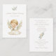 Una carta sencilla y encantadora para el bautismo de una niña, con un ilustracion dulce de un pequeño vestido de blanco con alas de ángel. El ilustracion es totalmente personalizable y se puede sustituir fácilmente por una foto de su elección. Estas tarjetas hacen bellos favores de bautismo y recuerdos sentidos para sus invitados.