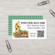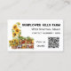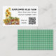 Tarjetas de visita de mercado con temática agrícola. Los girasoles y las verduras en las estanterías son el diseño de las tarjetas blancas con texto negro. También agregue un código QR para dirigir a los clientes a más información en línea. Reemplace la plantilla de código con su propia imagen de código. Los cheques de gingham verde cubren la parte trasera de las tarjetas.