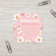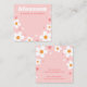 Tarjeta de visualización de joyería de pendiente cuadrada con flor de fresa blanca en un fondo rosa y nombre de la empresa o diseño en un tipo de letra retro.