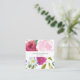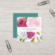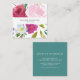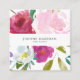 Una hermosa tarjeta de visita cuadrada de colores con un ramo de flores acuáticas audaces en tonos rosas como fondo, con un rectángulo blanco y tu nombre en el medio. El reverso está verde azulado con los datos de contacto en blanco.