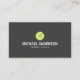 Un cochecito de tenis gris oscuro y elegante con una bola de tenis verde sobre un fondo gris oscuro. Nombre y título del Personalizable / nombre de la empresa en la parte delantera y la información de contacto en la parte posterior.