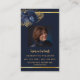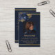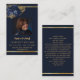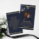 Un fondo azul oscuro, un marco falso dorado y espacio para tu foto. Decorado con flores azules. Personalice y agregue el nombre, las fechas y el texto. Texto dorado.