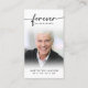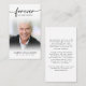 Fotografía De Simpatía Funeral Para La Tarjeta De Oración De Los Corazones. Mantenga la memoria de un ser querido cerca con esta tarjeta de oración personalizada personalizado que incluye una foto atesorada, el título PARA SIEMPRE EN NUESTROS CORAZONES, nombre y fechas y un mensaje de recuerdo sentido editable. Con su sencillo pero elegante diseño clásico en blanco y negro y su escritura moderna con toques, hace un gran placer para compartir en un funeral, servicio conmemorativo o celebración de la vida y ofrece confort y un homenaje duradero para la familia y amigos. Su tamaño pequeño y portátil de 3,5x2" (tamaño de cartera) hace que sea conveniente para los seres queridos llevarlo con ellos como recordatorio de la vida y el espíritu de su ser querido. La personalización hace que cada tarjeta sea única.