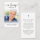 Moderna foto funeraria de memoria amorosa en nuestra tarjeta de oración cruzada del corazón. Mantenga la memoria de un ser querido cerca con esta tarjeta de oración personalizada personalizado que incluye una foto atesorada, el título EN MEMORIA DE AMOR, nombre y fechas en la parte delantera y una oración editable o su homenaje de recuerdo acentuado con una cruz simple. Con su sencillo pero elegante diseño clásico en blanco y negro y su escritura moderna con toques, hace un gran placer para compartir en un funeral, servicio conmemorativo o celebración de la vida y ofrece confort y un homenaje duradero para la familia y amigos. Su tamaño pequeño y portátil de 3,5x2" (tamaño de cartera) hace que sea conveniente para los seres queridos llevarlo con ellos como recordatorio de la vida y el espíritu de su ser querido. La personalización hace que cada tarjeta sea única.