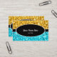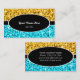 Plantilla de tarjeta de visita con un diseño moderno con estrellas diseminadas sobre un estilizado fondo "secuin look" en tonos dorados y azules amarillos con un ovalado negro y un borde de rayas con texto blanco y blanco. El texto puede cambiarse fácilmente utilizando la plantilla proporcionada o haciendo clic en el botón "Personalizar" para realizar más modificaciones. Tenga en cuenta que se trata de una imagen de arte digital impresa, que no brilla ni contiene purpurinas o secuencias reales.