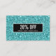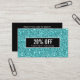 Moderno, con descuento para el trabajo en red o tarjeta de cupón con imagen digital de un lujoso patrón de purpurina turquesa. Superposición de franja negra. Ideal para los profesionales de belleza, moda, entretenimiento y eventos. Nota: La secuencia es un efecto impreso, no hay purpurina en la tarjeta. Ideal para salones de belleza, spas, cosmetólogos, esteticistas, estudios de danza, boutiques, diseñadores, estilistas de cabello y moda o cualquier otro profesional que conozca la imagen. Ideal para artistas de uñas, peluqueros, tiendas de regalos y más