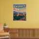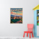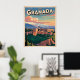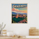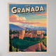 Retroceder en el tiempo con este afiche de viajes de estilo vintage de Granada, España. Presenta la emblemática Alhambra y las montañas de Sierra Nevada en cálidos colores andaluces. Perfecto para viajeros, amantes de España y aficionados al arte de viajes retro.