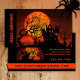 Tarjeta de negocios de Halloween con la imagen de una casa embrujada a la luna llena.