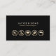 Esta casa y la tarjeta de visita general de reparación cuentan con un fondo negro de chorro. En la mitad inferior de la tarjeta aparecen cinco iconos dorados relacionados con las reparaciones de la casa, con el nombre de su empresa y el eslogan o el texto en negrita en la mitad superior. Los datos de contacto aparecen en la parte posterior de la tarjeta. Los pequeños iconos crean un aspecto profesional muy impresionante.