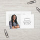 Esta tarjeta de visita presenta un diseño fotográfico de estilo retrato con su nombre y título, adecuado para muchos títulos profesionales independientes como consultor, desarrollador de contenido, editor, consultor de ventas, etc. En el lado inverso se muestra la información de contacto y el nombre comercial. Puede personalizar el tamaño del texto, el tipo de letra, para que se ajuste a su propio estilo personal. Reemplace esta foto del titular del lugar de ejemplo con su propia tarjeta de visita orientada al retrato.