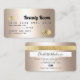 Una elegante y moderna tarjeta de crédito estilo cabellero y maquillador estilo tarjeta de crédito estilo tarjeta de crédito con una tipografía moderna de escritura en una moda color amarillo dorado Relieve metalizado metálico de fondo moderno. todo el texto es personalizable, agrega tus medios sociales. Con una franja dorada falsa. Añada su logotipo, su código de monograma y QR.
