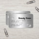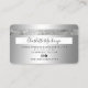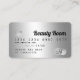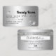Una elegante y moderna tarjeta de crédito estilo cabellero y maquillador estilo tarjeta de crédito estilo tarjeta de crédito con una moderna tipografía de escritura en un fondo moderno de moda en moda de Relieve metalizado metálico gris plata. todo el texto es personalizable, agrega tus medios sociales. Con una franja de plata falsa. Añada su logotipo, su código de monograma y QR.