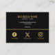 Da una impresión sorprendente con esta moderna tarjeta de visita en negro y oro, diseñada para blogueros, empresarios y profesionales que quieren mostrar su marca con estilo audaz. El elegante fondo negro ofrece sofisticación contemporánea, mientras que los acentos con efecto oro impresos resaltan su nombre de negocio, detalles de contacto y cuentas de medios sociales para una clara visibilidad. Los iconos sociales personalizados y los espacios dedicados para Facebook, Twitter (X) y las cuentas de enlace web de Instagram permiten una fácil y profesional red de contactos tanto en línea como fuera de línea. Tenga en cuenta que el efecto oro está impreso, no el Relieve metalizado. Para actualizaciones de iconos o detalles personalizados, el contacto directo es bienvenido.