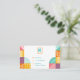 Tarjeta de visita frontal y posterior con motivos coloridos. Los datos de contacto incluyen Instagram, número de contacto y dirección.