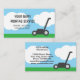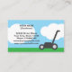 Plantilla de tarjeta de negocios de servicio de siembra de césped simple para jardinero. Diseño cuidado con cortadora, hierba verde, cielo azul y nubes blancas. Perfecto para jardineros autónomos o paisajistas que cuidan de jardines privados, patios, campos, parques y más.