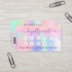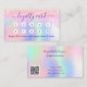 Un fondo holográfico de moda con colores unicornio y colores arcoiris en rosa, violeta, oro rosa, verde menta. Decorada con tonterías de purpurina. Al frente: Añade un descuento. Atrás: Personaliza y agrega tu nombre, título, número de teléfono, correo, dirección del sitio web, código qr a tu sitio web. Letras moradas. Sin purpurina en la espalda.
