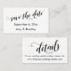 Mantén a tus invitados bodas al tanto de todos tus detalles con estos completos insertos de favores matrimoniales. Estas tarjetas de bonito reflejan un estilo elegante e informal. Las sobreimpresiones de texto de moda fueron diseñadas usando un tipo de letra de escritura moderno en negro. Una parte dice "salva la fecha" y la otra, simplemente dice "detalles". Utilice los campos de plantilla para personalizar de estas tarjetas de gabinete con su información personal. Impreso usando la "tecnología de tarjetas de visita" el tamaño práctico será fácil de mantener a mano. Envíenlos por correo con sus correos tradicionales, y manténganse unos cuantos para compartir con los que necesitan uno o dos extra! El fondo es blanco y este color editable se puede cambiar a cualquier cosa de la paleta boda que elija; todo el texto editable aparece en negro. // 99 // Diseñado por Melody Watson para la Muserie de Papel.