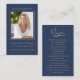 Dimensiones de la tarjeta de visita: 3.54" x 2.165" Plantilla simple para la tarjeta de oración funeraria con tipografía elegante de escritura dorada sobre un fondo azul clásico. Personaliza con tu foto favorita de tu ser querido, nombre y fecha. El diseño de la tarjeta es un elegante corazón cruzado de oro y un mensaje personal que puede ser personalizado para adaptarse a sus necesidades únicas.