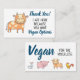 Con su vaca super linda, estas tarjetas de visita son la manera perfecta de agradecer a los restaurantes o cafés que sirven comida vegetal vegana y hacerles saber cuánto lo aprecias. La parte trasera de la tarjeta contiene cuatro encantadores animales personalizados (vaca, cerdo, conejo y gallo), con las palabras Vegan para los sin voz