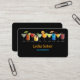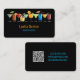Contemple esta elegante tarjeta de visita de barman con una hilera de coloridos ilustraciones de cócteles sobre un elegante fondo negro. Perfecto para mixólogos, barberos de eventos o dueños de bares, esta tarjeta moderna combina diseño audaz con información práctica de contacto y un escaneado código QR. El nombre y los detalles del personalizable garantizan que su tarjeta sea tan única y profesional como usted. Ideal para hacer networking en eventos, conciertos o fiestas privados.