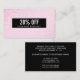 Moderno, giratorio de descuento para redes o tarjeta de cupón con imagen digital de patrón secuencial rosa. Superposición de franja negra. Ideal para los profesionales de belleza, moda, entretenimiento y eventos. Nota: La secuencia es un efecto impreso, no hay purpurina en la tarjeta. Ideal para salones de belleza, spas, cosmetólogos, esteticistas, estudios de danza, boutiques, diseñadores, estilistas de cabello y moda o cualquier otro profesional que conozca la imagen. Ideal para artistas de uñas, peluqueros, tiendas de regalos y más