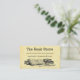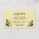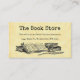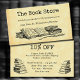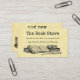 Una tarjeta de cupón de descuento de negocios para la tienda de libros tipo plancha de libros con letras antiguas y espacio para tu información en la parte delantera y trasera, con arte de libros antiguos y una tabla de escritura en la parte delantera y en la parte trasera de libros antiguos, sobre un fondo de pergamino falso.