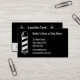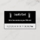 Atrás: Tarjeta de Lealtad en Blanco y Negro. Obtén un servicio gratuito en tu décima visita. Números 1 a 9. Libre. Delante: Un asta de barbero está a la izquierda. Al lado de la barra de barbero hay campos para tu texto, como tu nombre, nombre de negocio, dirección, número de teléfono, correo electrónico y/o sitio web. El texto es blanco y el fondo es negro. Hay un bastón de barbero en la parte trasera.