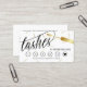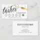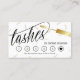 Tarjeta de fidelidad a la moda para su negocio de lash con latigazos escritos en un sencillo guión sobre un fondo blanco con finas barras de oro y una varita de rímel. Añade tu nombre también. La tarjeta de fidelidad es para la sexta visita o tratamiento con descuento, con un corazón negro marcándolo. Escriba su nombre, negocio e información de contacto en la parte posterior con texto negro en un fondo blanco.