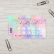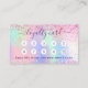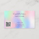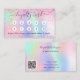 Un fondo holográfico de moda con colores unicornio y colores arcoiris en rosa, violeta, oro rosa, verde menta. Decorado con polvo falso purpurina En la parte delantera: Añade descuento. Atrás: Personaliza y agrega tu nombre, título, número de teléfono, correo, dirección del sitio web, código qr a tu sitio web. Letras moradas. Sin purpurina en la espalda.
