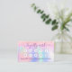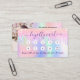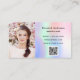 Un fondo holográfico de moda con colores unicornio y colores arcoiris en rosa, violeta, verde menta. Decorado con goteo. Al frente: Añade un descuento. Atrás: Personaliza y agrega tu foto, nombre, título, número de teléfono, correo, dirección del sitio web, código qr a tu sitio web. Letras moradas.