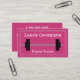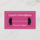 El diseño de esta tarjeta de visita incluye un fondo magenta, un borde de doble línea con una línea discontinua en el medio y una simple representación de una barbacoa. Podría ser utilizado por un profesional como un entrenador de fitness, entrenador de peso, entrenador personal o experto en fitness. El nombre, la profesión y los datos de contacto pueden ser personalizados.