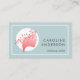 Un sencillo diseño de tarjetas de visita azul polvoriento con un logo femenino en coral y blanco que representa la cabeza de una mujer adornada con una arboleda de hojas, este diseño trabaja maravillosamente para artistas de maquillaje, peluquerías y uñas, spas, la industria de la moda o empresas que brindan cuidados y servicios a las mujeres. Se proporciona una plantilla de texto de ejemplo que puede personalizar fácilmente con el texto deseado en la parte delantera y trasera de la tarjeta.