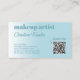 Tarjeta de presentación de artista de maquillaje artístico de estilo minimalista elegante y hermosa. Tarjeta de presentación contemporánea de color azul océano claro con una fuente moderna retro y minimalista de color verde aguamarina y blanco sofisticado y clásico. Haga clic en 'Personalizar' para encontrar la plantilla lista para ser personalizada con el nombre de su negocio único, profesión y información de contacto, texto y código QR de su elección. Este diseño particular bonito y único fue hecho para aquellos que gustan de diseños clásicos sofisticados y fuertes.