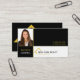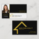 Esta tarjeta de visita está diseñada para un agente inmobiliario. La tarjeta está en sección para la imagen de su perfil, nombre e información de contacto. La decoración en tonos dorados, negros y blancos. Un icono de una casa pequeña le permite a su cliente conocer instintivamente en qué negocio se encuentra. Captura y retención de clientes con esta tarjeta de negocio de corredores diseñada profesionalmente.