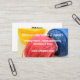 Una tarjeta de visita para un negocio de costura, ropa, sastre, diseñador u otro tipo de comercio textil y de tela que incluya rollos de algodón coloreado.