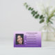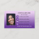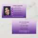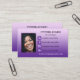Una moderna tarjeta de presentación de diseño con tu propia foto enmarcada por un fondo morado con íconos de medios sociales. Puede borrar los iconos si no los necesita.