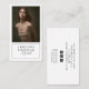 Esta tarjeta de visita contiene una dramática foto retrato, perfecta para una modelo, actriz, autor o cualquier persona que necesite un estilo retrato audaz con un efecto dramático. En el lado inverso se muestra la información de contacto y el nombre comercial. Puede personalizar el tamaño del texto, el tipo de letra, para que se ajuste a su propio estilo personal. Reemplace esta foto del titular del lugar de muestra con su propia foto de orientación vertical dramática. Borde elegante alrededor del nombre y el título.