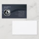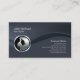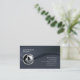 Esta sencilla y elegante tarjeta de presentación de peluquería es de color negro. Una onda de matiz negro se mueve de izquierda a derecha, dividiendo la tarjeta en dos secciones. Un icono circular de estilo de cabello cromado se sienta en esta onda, en el lado izquierdo de la tarjeta, mientras que su nombre y título aparecen en la parte superior izquierda y su nombre de negocio y detalles de contacto aparecen en la parte inferior derecha. Diseñado para empresas o profesiones relacionadas con la moda, la belleza, el estilo, la ropa, los cosméticos, el maquillaje, las mujeres, los temas femeninos.