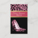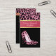 Elegante tarjeta de moda de negocios hecha con un patrón de jaguar rayado rosa y negro, con un sólido negro por debajo. Una banda de tono rosa y dorado debajo de la huella animal forma un bloque de texto, con texto rosa claro personalizado, y gráficos de un tacón de papel de jaguar rosa y negro decorando la parte inferior de la tarjeta. La parte trasera está hecha en negro, con la huella jaguar rosa, en el lado izquierdo con una banda rosa y dorada. El texto rosa claro, en la parte delantera y trasera, está listo para personalizar a sus necesidades. Una carta preciosa que ofrece una primera impresión impresionante.