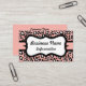 Esta tarjeta profesional está decorada con un suave estampado de leopardo rosa y negro. Personalizar esta tarjeta de visita para satisfacer sus necesidades. El diseño proviene del arte original. Utilice esta elegante tarjeta de visita para un salón de belleza, un cosmetólogo, una peluquería, un salón de uñas, moda, una boutique, una panadería, un peluquero, un salón de belleza, un spa, un músico, un maquillador...