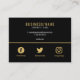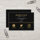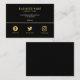 Una sofisticada y moderna tarjeta de visita con un fondo negro mate con elegantes acentos dorados y tipografía minimalista. La sección superior muestra el nombre de su empresa o negocio en letras mayúsculas en negrita y doradas, seguidas de su correo electrónico, número de teléfono y sitio web en blanco limpio. Una fina línea dorada separa los detalles de contacto de tres íconos dorados de las redes sociales, lo que le da un aire equilibrado y contemporáneo. Esta tarjeta es ideal para emprendedores, creativos y profesionales que quieren dar una impresión memorable con un diseño moderno y elegante.