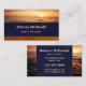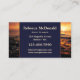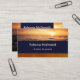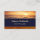 Elegante tarjeta de visita con una puesta de sol en el océano con colores azul oscuro y auburn y rayas doradas rosas. En la parte trasera también se pueden ver los destellos de luz dorada rosa. Hermoso para un planificador de eventos o experto en viajes en luna de miel.