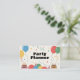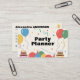 Una tarjeta de presentación de planificador de fiestas decorada con pasteles de cumpleaños, globos de colores, sombreros de fiesta, giros y confeti. Perfecta para tarjetas de invitación o para organizadores de eventos como fiestas de cumpleaños para niños o adultos, lanzamientos de productos, baby shower, celebraciones familiares, aniversarios de boda, despedidas de soltero, fiestas temáticas, etc. La parte trasera de la tarjeta tiene información de contacto completa y una lista de servicios.