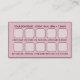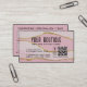 Esta tarjeta de visita tiene una ágata de purpurina rosa y dorado con tus detalles en la tipografía sans-serif, y cuenta con un sistema de recompensas clásico en la parte trasera para que los clientes regresen y reciban algo, es decir, descuento, artículo gratis, etc. Rellene los detalles con el nombre de su empresa, servicio de negocios, número de teléfono, sitio web, dirección social, dirección URL de código qr, horario de la tienda o mensaje, e información de recompensa en la parte posterior.
