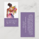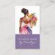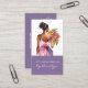 Elegante vestido de novia costea tarjeta de negocios, con acuarela de arte de un chica con un vestido de bonito colorido que sostiene flores, sobre un fondo blanco y violeta. Personalice el texto para adaptarlo a sus necesidades empresariales. Una preciosa tarjeta para tu negocio de sastrería.