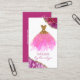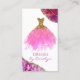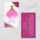 Elegante vestimenta costurera tarjeta de visita, con gráficos de un vestido purpurina rosa y dorado, con un fondo blanco, con acentos rosa y dorado. Personalice el texto para adaptarlo a sus necesidades empresariales. Una preciosa tarjeta para tu negocio de sastrería.