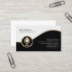 Esta tarjeta de presentación profesional incluye segmentos en blanco y negro separados por una banda dorada ondulada. Un elegante icono dorado de un micrófono se encuentra en la parte inferior izquierda del diseño, que generalmente es adecuado para entretenimiento, fiesta, eventos, lanzamiento, mago, animadores, cantante, espectáculos, conciertos, temas de cena.